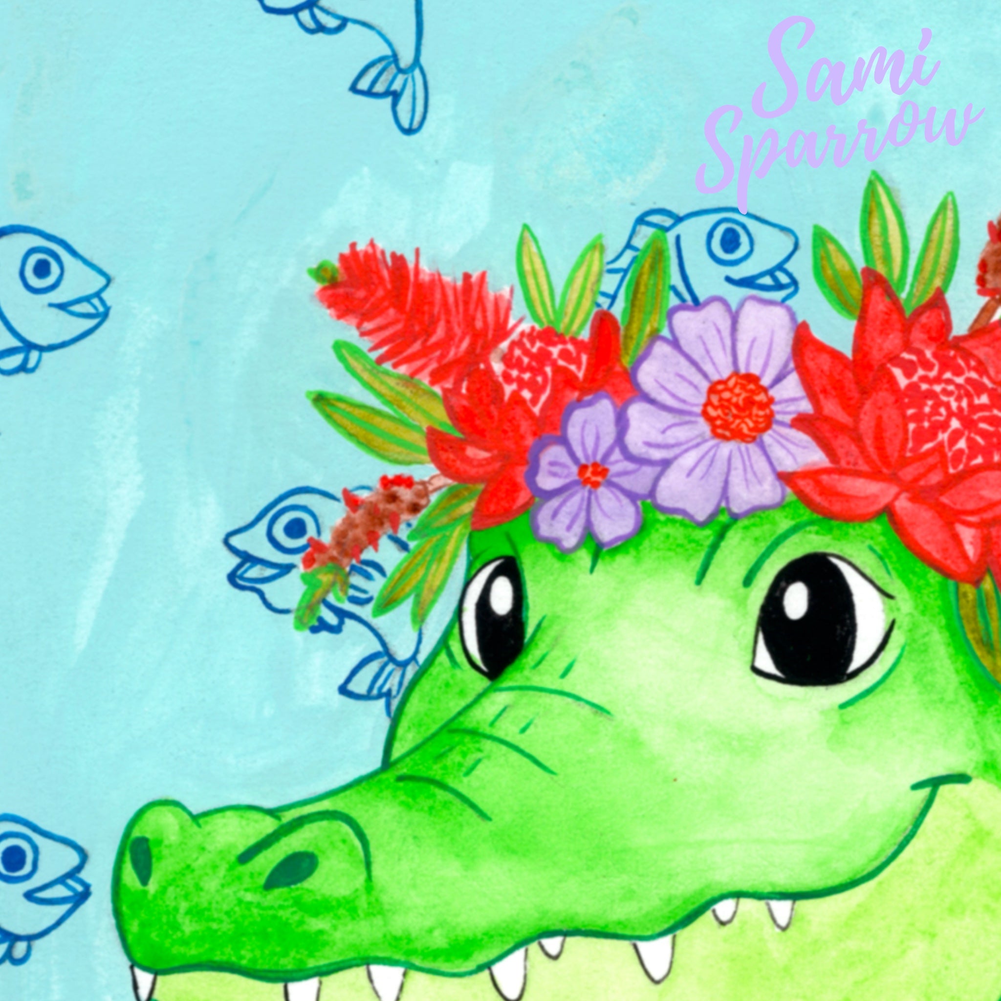 Bright, fun, and bursting with personality, this charming Crocodile art print is perfect for adding a playful splash of colour to any room. Featuring a friendly green croc wearing a vibrant floral crown of Australian native blooms, this illustration blends bold character design with soft, hand-painted textures. The cheerful blue background, sprinkled with quirky fish motifs, creates a lively underwater vibe that kids and adults alike will adore.