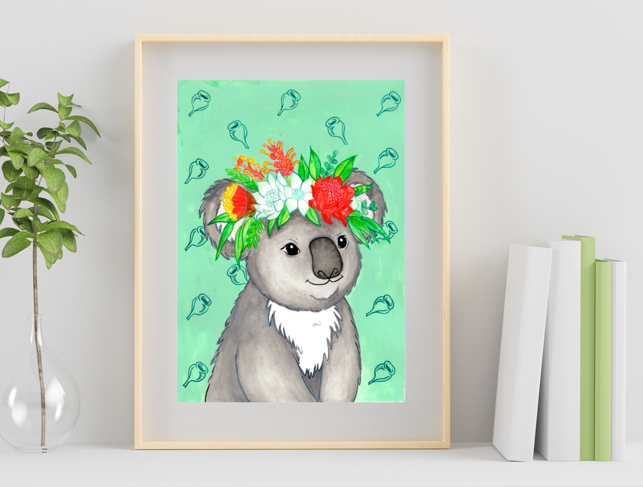 Bring a touch of Australian charm to your space with this delightful Floral Koala Art Print. Featuring a sweet, hand-illustrated koala adorned with a vibrant native flower crown, this artwork blends soft, playful character design with bold botanical colour. Set against a refreshing mint-green background with subtle eucalyptus motifs, it adds warmth, whimsy, and a distinctly Aussie feel to any room.