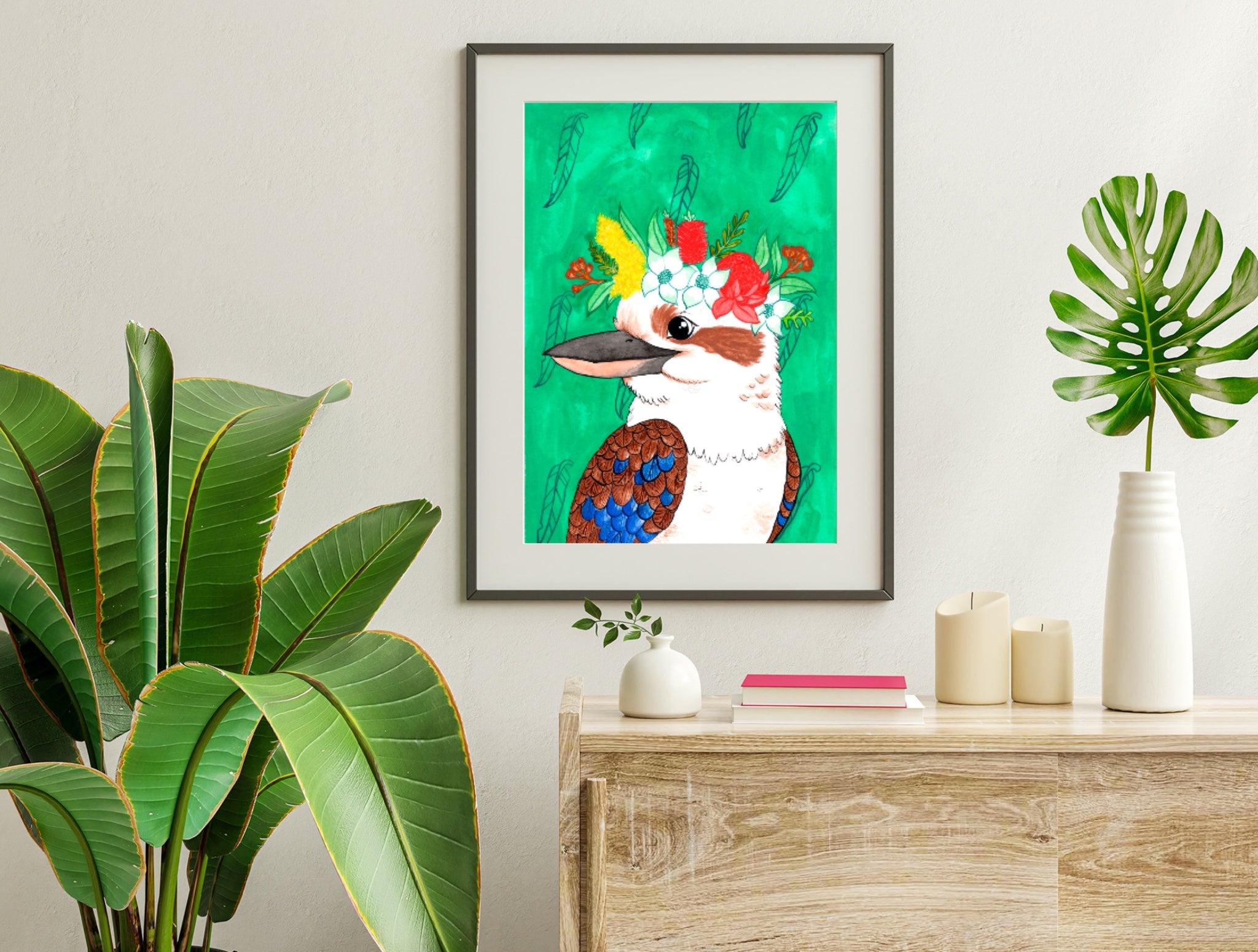 Brighten your space with this joyful Floral Kookaburra Art Print, featuring a beautifully illustrated kookaburra adorned with a vibrant native flower crown. Set against a rich, leafy green background, this artwork captures the playful spirit of one of Australia’s most beloved birds while adding a fresh, modern aesthetic to any room.